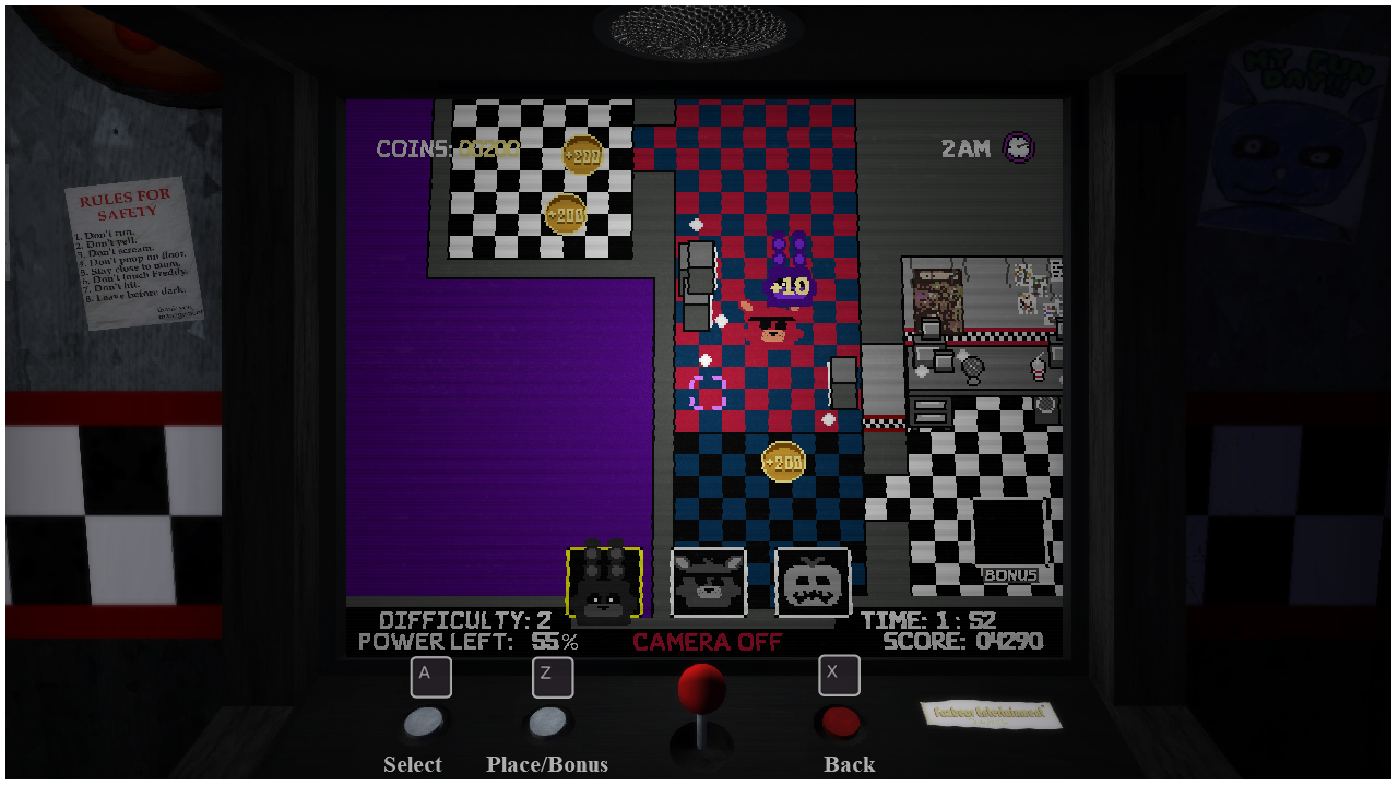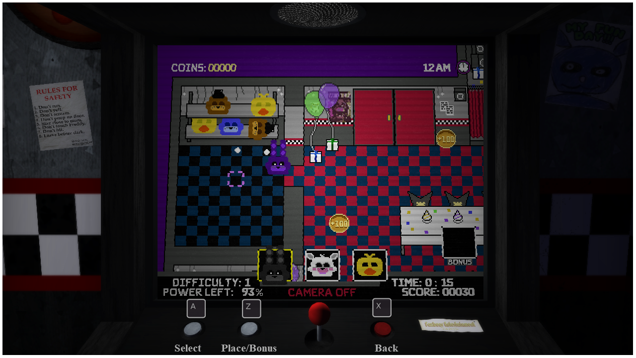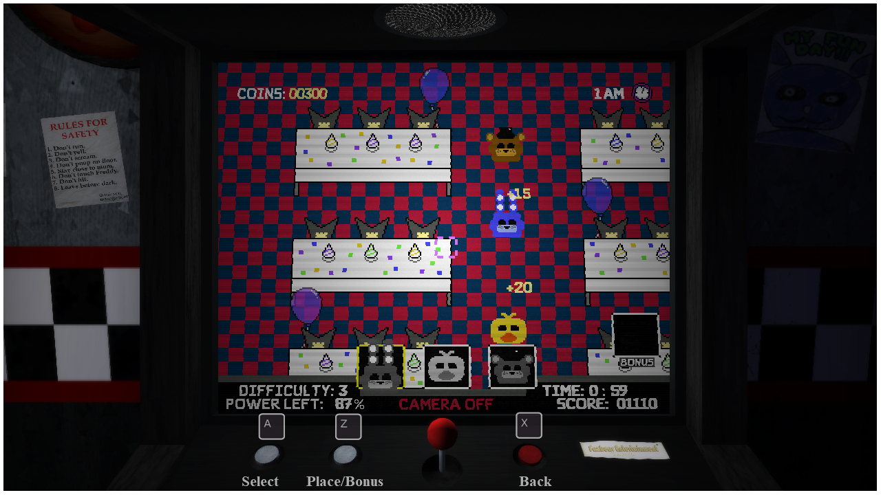 • The starting position of the animatronics is unique to each of them, as the night goes on, you will unlock other rooms closer to the security guard to win more easily.