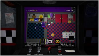 In this arcade style game, you can control the famous cartoon characters from the Five Nights at Freddy's series. Each game begins by selecting your team of animatronics that will help you catch the security guard during the night shift. Each animatronic has different characteristics, such as their speed, the points they get or their starting position. If you catch the security guard, you win the game but if the clock reaches 6AM before, it's game over. You have to pick the most efficient team and find the perfect way to get your hands on the guard. And don't forget to get the highest score!